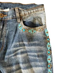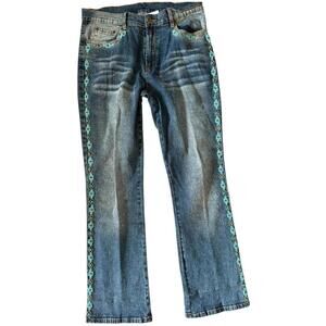 • Medium wash denim with turquoise and brown Southwestern-inspired embroidery along pockets and outer legs