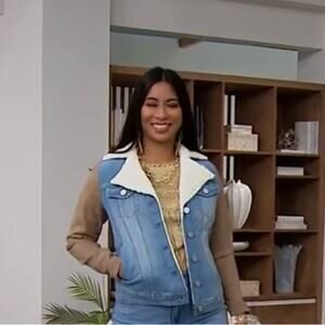Diane has revamped her classic jean jacket for the coldweather season with chic, faux Sherpa fleece detail and faux suede sleeves.