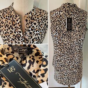 New with tags! This sleeveless button down shirt is a classic. Sophisticated leopard print is perfect for work or play. This shirt is a longer length, great with black jeans for a night out!