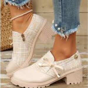 DG Tweed Patch Bowknot Chunky Heel Loafers Shoes Slip On Retro Chic Women's 6M