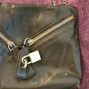 It's extremely hard for me to part with this bag. It's so convenient and stylish. It can be worn over the shoulder or as a cross body. Made out of leather, Which has been worn out on the sides as shown in the picture. May be restored for a fraction of the cost. Has a lot of compartment so it's a lot of stuff.