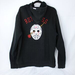 The DGK Fierce Ruthless Black Jason Embroidered SK8R Pullover Hoodie in size X-Large is a stylish and comfortable activewear piece for men. Made from a cotton blend fleece material, this solid black hoodie features an embroidered Friday The 13th character design on the front and the brand's logo accents. It includes a hood, pockets, long sleeves, and is designed as a pullover style for easy wear. Perfect for casual everyday wear or skating activities.