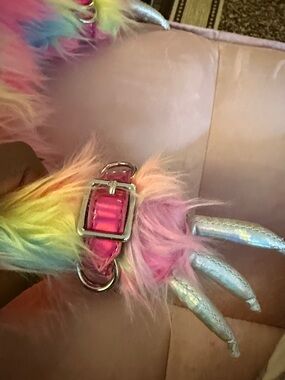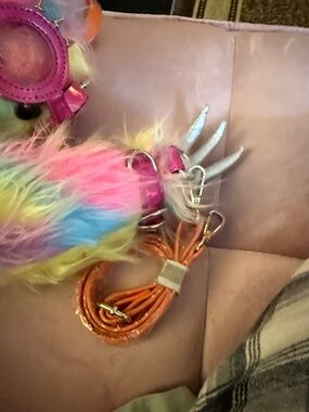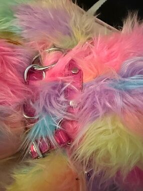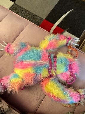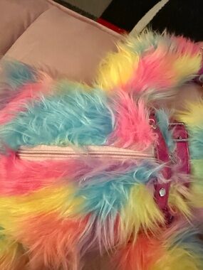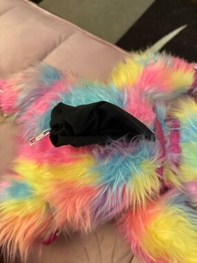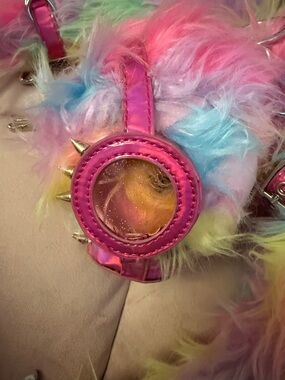 don't judge a species by their beats. Rave until dawn with this sloth backpack that has a tie dye faux fur construction, sparkly holographic patent glitter straps and detailing, attached glitter sunglasses, and a hidden zipper closure.
