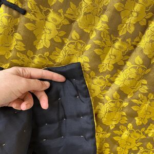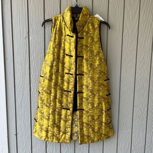 New with tags DH Silk vest handmade in Vietnam from 100% silk, featuring exquisite craftsmanship and a bold cheongsam-inspired design. The gold and black floral jacquard fabric is fully hand-quilted and finished with functional pankou (frog) closures down both the front and sides, allowing for a wide range of styling options—wear it open, closed, layered, or even asymmetrically.