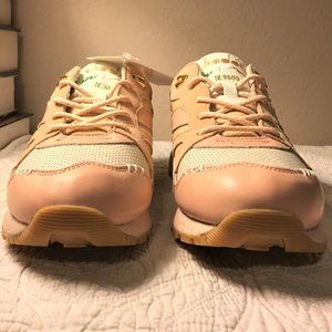 Diadora's iconic N9000 runner gets dressed in ice cream colors. Classic silhouette, smooth tumbled leather uppers, suede overlays & elegant gold accents & embroidery on the eyelets, midsole, heel • Smooth Leather Over • Perforated Toe Box • Speckled Midsole • Metallic Embroidered Branding • Feature Stitching To Toe • Gum Rubber Outsole • Spare set of Laces NWT, No box. Tag says: "UK 8 / USA 8.5". Unisex styles are in Men's sizing. Typically, women should add 1.5 to a Unisex size (8.5 = 10)