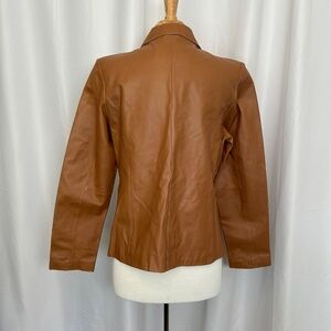 DIALOGUE brown leather jacket. Snap front. Measures approximately 21" arm pit to arm pit. Measures approximately 26" from shoulder of jacket to front hem of jacket. Comes from a smoke-free home.