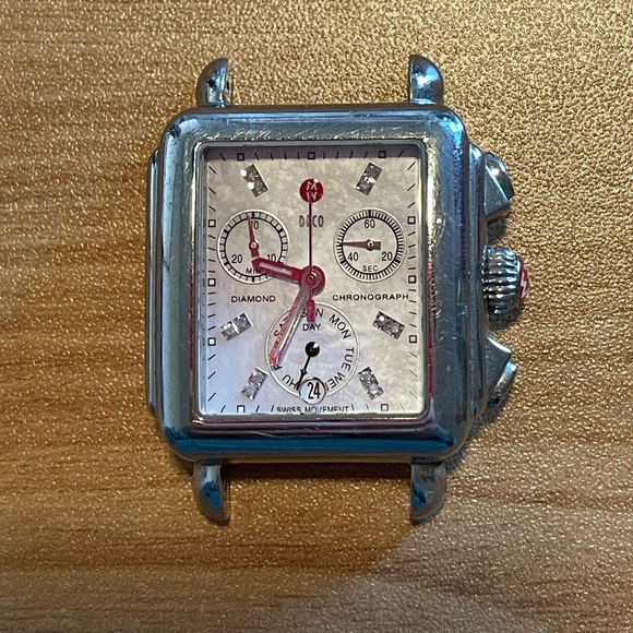 Michele Deco Diamond Chronograph. Watch has 12 diamonds (0.05 TCW) Sapphire crystal and stainless steel. There are scratches on the stainless and the dial features a mother of pearl background with 12 diamonds.