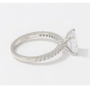 Elegant 2 ct princess cut diamonique engagement ring with full cut round on both sides of stone. Rodium plated sterling silver for enhanced beauty and increased durability