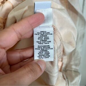 In good preloved condition. No stains or rips. Has distressing on hem line as shown in photo. Has peach colored lace detail throughout. Has snap button front closure. Size 10. SHELL 76% NYLON, 29% POLYESTER COMBO, 55% SILK, 45% WOOL. LINING 60% COTTON, 40% SILK.