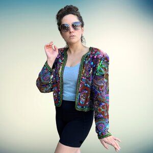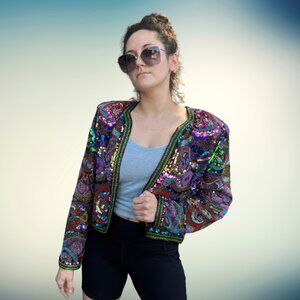DIANE FREIS Black 100% Silk Hand-Beaded Sequin Long Sleeve Jacket