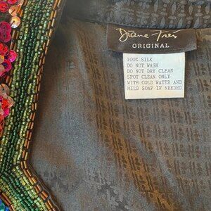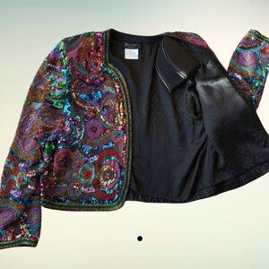 The Diane Freis Black 100% Silk Hand-Beaded Sequin Long Sleeve Jacket is a luxurious and elegant piece from the 1990s. Made in Hong Kong, this original cocktail/formal jacket features intricate hand-beading and sparkling sequins, perfect for special occasions. The multi-color design adds a touch of glam to this eveningwear style, which is available in a size S/M. This vintage jacket exudes formal sophistication and timeless charm, making it a stylish addition to any woman's wardrobe.