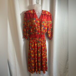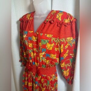 Rare & collectible vintage Diane Freis dress from the 1980s featuring a bold equestrian horse print in her signature colorful, free-flowing style. This one-size (OS) piece is designed with dramatic shoulder pads, a stretchy smocked waist, and a tiered skirt — all classic hallmarks of Freis’ iconic silhouettes.