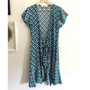 A blue geo print adds iconic DVF style to this Diane von Furstenberg V-neck wrap dress.