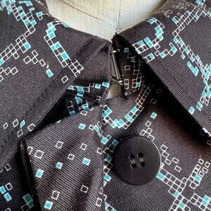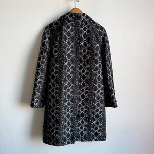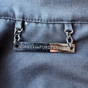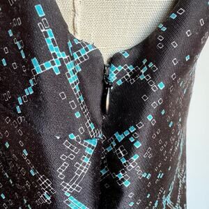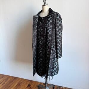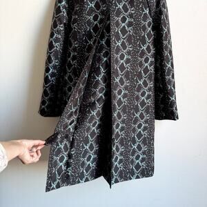 Details: Designer DVF all over print sleeveless sheath dress and outerwear mid length trench coat. Dress zips at the side and jacket has a metal hook closure. Digital snakeskin print formed by tiny turquoise & white pixels all over each piece. Color is black but has an almost dark chocolate sheen to it. Very eye catching.
