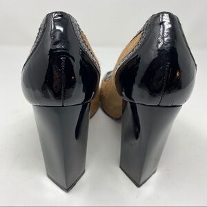 DIANE VON FURSTENBERG Calf Hair Patent Leather Peep Toe Heels, Size 7.5