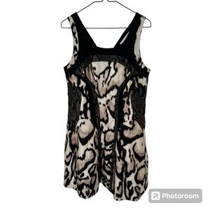 A silk-softened minidress juxtaposes bold animal prints with a girlish silhouette for party-perfect drama. Visually slimming panels and a scalloped waistline ease the lean square-neck bodice into a flouncy finale. Hidden back-zip closure. Lined. Wool/silk; dry clean.