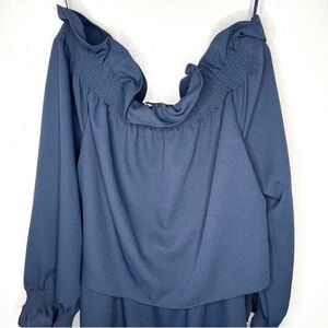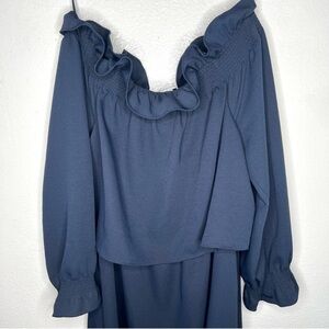 Ebullient ruffles circle the shoulder baring smocked top of this easy going popover dress with a faux layered look. Long sleeves with elastic cuffs and partially lined. Excellent pre-owned condition, no flaws.