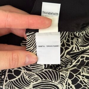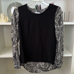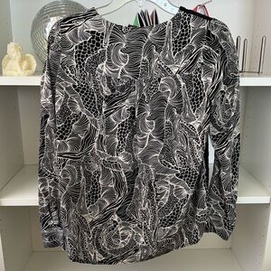 Diane Von Furstenberg long sleeve 100% silk blouse in black and white print. Featuring a scoop neck and high-low style. Side slits. Double button cuffs. Size 2. Great preloved condition