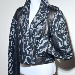 Diane Von Furstenberg motorcycle jacket with lamb leather sleeves and trim. Jacket is lighter-weight virgin wool, with an abstract leopard print in grey and black. Gunmetal zippers and snaps, side pockets with full zippers and leather trim. Sleeves are 100% leather, with full zips on each forearm like a traditional moto jacket. Fully lined. In pristine condition. Loose fit, generous arms.
