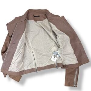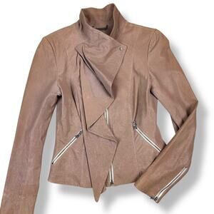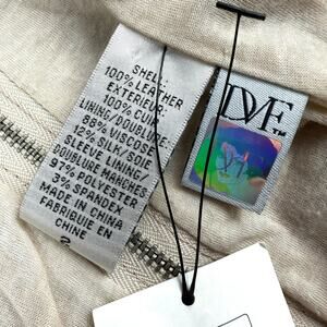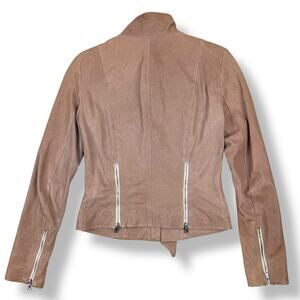 DIANE VON FURSTENBERG tan lamb leather jacket. Fully lined in viscose and silk fabric. Zippers up the front with additional snap closure. Zippered side pockets, zippered up the back and on the sleeves. Excellent condition, there is still a partial tag attached on the inside. Marked size 2.