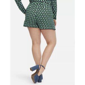 Chic and bold Diane von Furstenberg x Target limited-edition collaboration high waist wrap mini shorts skort in size 1x. Features a striking geometric arrow cube print in shades of green, blue, black, and white with a side tie detail for an adjustable, flattering fit. 2 on-seam side pockets. Hidden back zip closure. Crafted from 100% recycled polyester, this piece is lightweight, eco-friendly, and easy to style. Perfect for pairing with a blouse, tank, or fitted tee for a polished yet playful look. A versatile skort that transitions beautifully from casual daywear to evening chic, adding a statement pop to your wardrobe. New with tags / NWT.