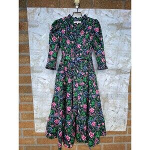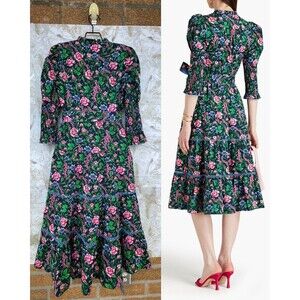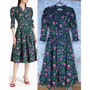 Retail $598 Cut from a soft and breathable cotton poplin, the Leylani midi dress feels structured and cool. This piece has a ruffled V-neckline, puffed shoulders, and smocked three-quarter sleeves. A tiered midi skirt with eyelet trim and a solid-colored belt gives it a bold and romantic feel. Has pockets.