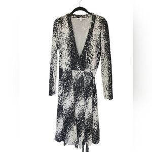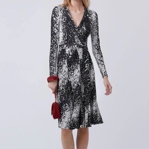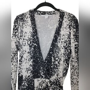 Chic wrap dress with a striking black and white pattern. Long sleeves and elegant silhouette. printed in a dramatic black and white paint splatter design,