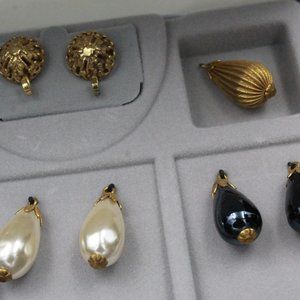 Presenting you the works of the sought after jewelry designer, Diane Von Fursternberg. Featuring this stunning earrings that has several interchangeable stones such as; champagne and peacock faux pearls, red poured glass and gold tone drop piece all connected to an 18k gold plated filigreed base with Post Backing Clasp. This comes with it's original box and is new old stock. This measures 1 3/4" long by 1/2" wide.