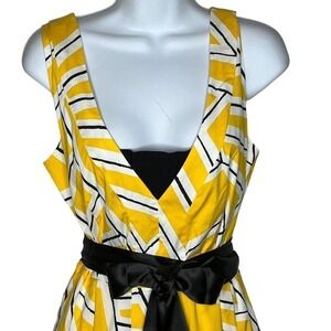 Diane Von Furstenberg Sz 12 Eliza Dress Pleated Belt Side Zip Yellow Black White Print Pockets Lined