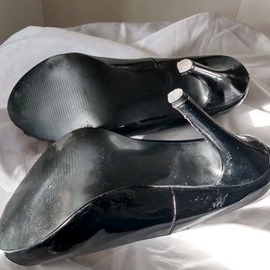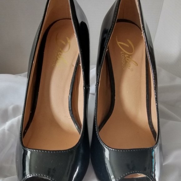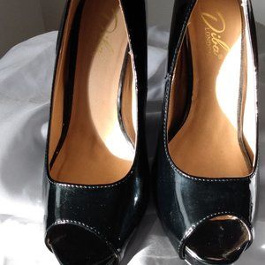 DIBA London Women's Stilletto Patent Leather High Heel Shoes, These open toe beautiful heels are pre-owned good condition, size 9.5 color black.