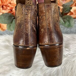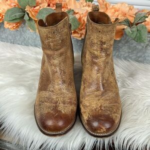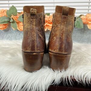 These brown ankle booties feature a distressed leather finish, offering a vintage charm. The side zipper ensures easy wear, while the medium stacked heel provides a comfortable lift. Perfect for adding a rustic touch to any outfit.