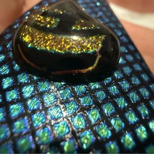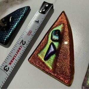 Bold, vibrant, and one-of-a-kind โ this stunning trio of handmade dichroic glass pins makes the perfect artistic accessory or gift ๐. Each brooch is crafted with layered glass, fused in kiln, and finished with dazzling textures and deep metallic tones that change in the light.