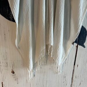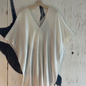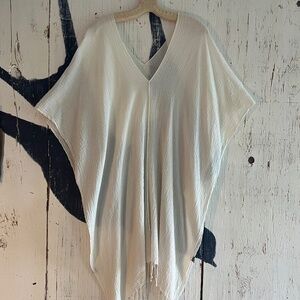 DIEMAR cotton gauze, poncho cover-up in soft lime, features he fringes open sides for easy pull over an instant cover-up for beach or pool, is super light crinkly gauze, V neck line and piping down the front, Very very lightweight easy to pack and travel with on any vacation or trip to somewhere exotic it adds just the right amount of bohemian flair. Is one size fits all so it is oversize and relaxed, fit very forgiven and very generous for all types of bodies.