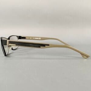 DIESEL frames in a black acetate featuring grey and black striped temple arms, and rectangular shape. Note: these frames contain corrective lenses, which will need to be changed by an optician before wear.