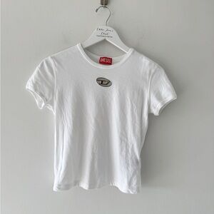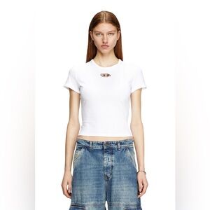 Cut from organic jersey cotton, this women's crew neck T-shirt features a slim silhouette with ribbed trims. The metallic Oval D cut out at the centre of the chest is a signature detail.
