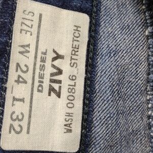 Diesel ZIVY Stretch Women's Blue Dark Wash Five Pocket Button/Zipper Front Closure Mid Rise Whiskering Straight Leg Denim Jeans. 98% Cotton, 2% Elastane. Faux Zipper Detail Back Pockets. Fictional Side Hem Zippers. Measurements approx. Flat Lay. Waist: 13, Rise: 8, Hips: 14.5, Inseam: 27. Size 24.