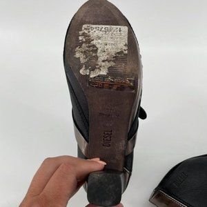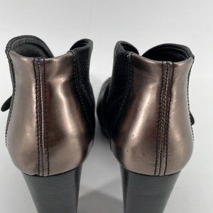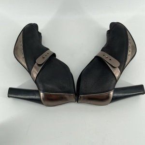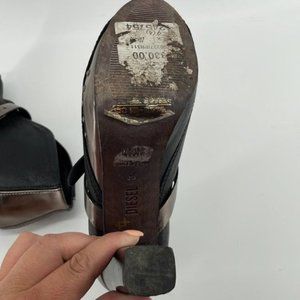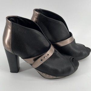 Wall flowers need not apply: this brave, new look from Diesel boasts serious style for serious fashionistas. This open-toed bootie in leather boasts a high collar for drama and metallic panels and studs for intrigue. A 4.5-inch heel and .75-inch platform concoct gorgeous curves that steal any show in Foile by Diesel.