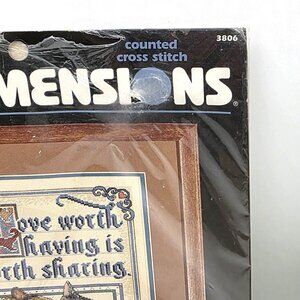 VINTAGE 1995 DIMENSIONS COUNTED CROSS STITCH KIT CATS "LOVE WORTH HAVING IS WORTH SHARING" #3806 Embark on a delightful stitching journey with the Dimensions Counted Cross Stitch Kit, featuring the charming theme of 'Cats Love Worth Having'. This kit, model #3806, comes complete with all the essentials to transform your space into a feline fantasy, including high-quality fabric/cloth, embroidery floss, a needle, instructions, and a color guide to ensure your masterpiece is nothing short of purr-fect.