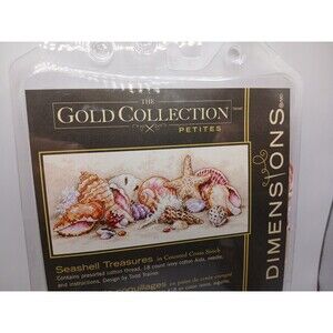 The DIMENSIONS CROSS STITCH KIT - Gold Collection Petites Seashell Treasures 65035 is a framed picture cross stitch kit by Dimensions. The kit includes a needle, fabric/cloth, thread/floss, and a thread organizer. The design features a seashell theme, perfect for those who enjoy creating intricate and detailed embroidery projects. The kit provides everything needed to create a beautiful hand-stitched piece of art, making it a great choice for crafters and cross stitch enthusiasts.