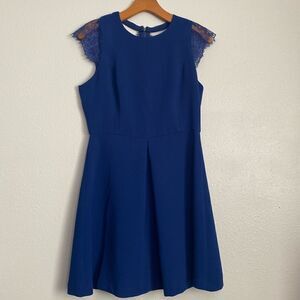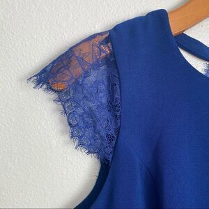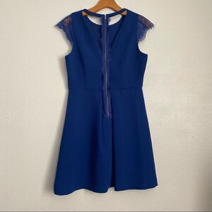 Adorable Dina Be navy blue dress. Accented with lace sleeves and a zippered back that also have lace. Cut out detail on the back. Above the knee length. Gentle preloved condition.