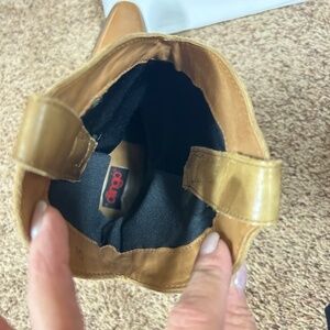 MY FEET WILL JUST NOT LET ME WEAR THESE BOOTS ANYMORE - THEY ARE REALLY PRETTY WITH THE TWO DIFFERENT KINDS OF LEATHER AND THE BUCKLE AT THE ANKLE - THEY HAVE A NICE 2 INCH RIDING HEEL THAT LOOKS VERY FASHIONABLE BUT I NEED TO STICK TO 1" HEELS- ALSO DINGOS SEEM TO RUN A LITLLE BIG - I USUALLY WEAR SIZE 7 BUT IN DINGO I CAN WEAR A SIZE 6 OR 6 1/2