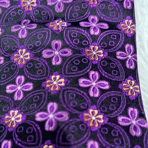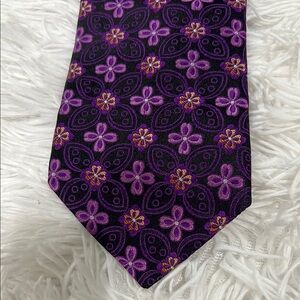 This striking tie features a deep purple base adorned with a repeating geometric pattern of stylized floral motifs in a lighter shade. The slight sheen suggests a luxurious silk-like material, making it an excellent choice for formal events. Its standard width ensures a classic look that complements various outfits.