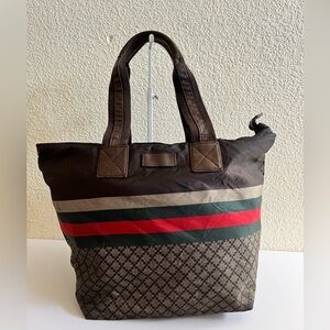 Exterior is made with canvas, features top zip osure, double leather handles, leather trim, and metal fitting.