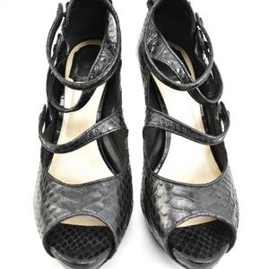 Black, leather "Python-design", peep toe heels/pumps accented by black, leather straps