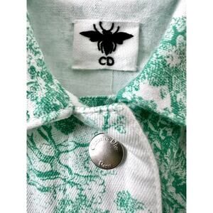 Part of the Dioriviera capsule, the shirtdress presents the Toile de Jouy Sauvage motif, a new take on the signature House pattern. Crafted in lightweight white and aquamarina cotton denim, it is accented by the House's hallmark bee and CD signature embroidered on the front. The short silhouette has a spread collar, patch pockets and flap pockets with metal Christian Dior Paris buttons. It showcases pleats and a tonal belt highlighting the waist. The short shirtdress will pair with other Dioriviera creations to complete the look.