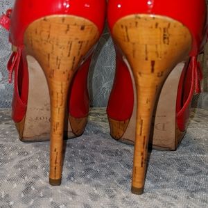 Gorgeous red patent leather peep toe pumps. Accented with bow on side encased in a metal closure engraved with Dior name. Heel height: 5 inches platform base is 1 inches.