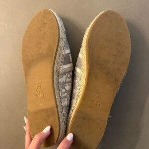 Stylish Dior espadrilles with logo design. Features blue and cream colors. Comfortable and chic.