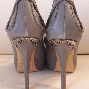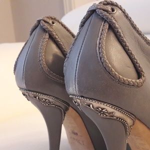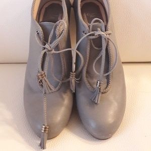 💓Exquisite metal tooling in silver on the heel give it a little touch of Western love! Braided leather edging and ties with "D" charms on the tassels. Small platform styling. Beautiful dove grey color.