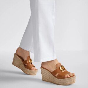 The 30 Montaigne wedge slide sandals are composed of camel brown calfskin and are highlighted by the contrasting gold-finish metal CD signature.