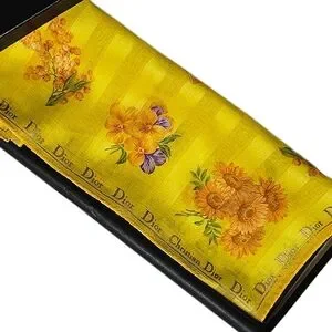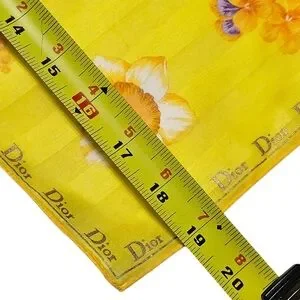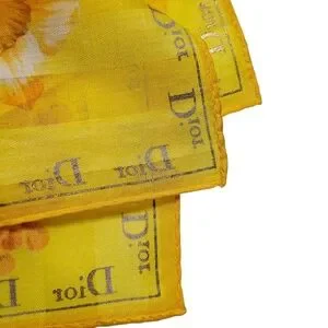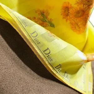 This is a lovely yellow scarf made by Christian Dior. It's new without tags and in perfect condition. It measures 19" X 19". It would be perfect for spring or vacation. The box is included. Offers are encouraged. Thank you for looking.